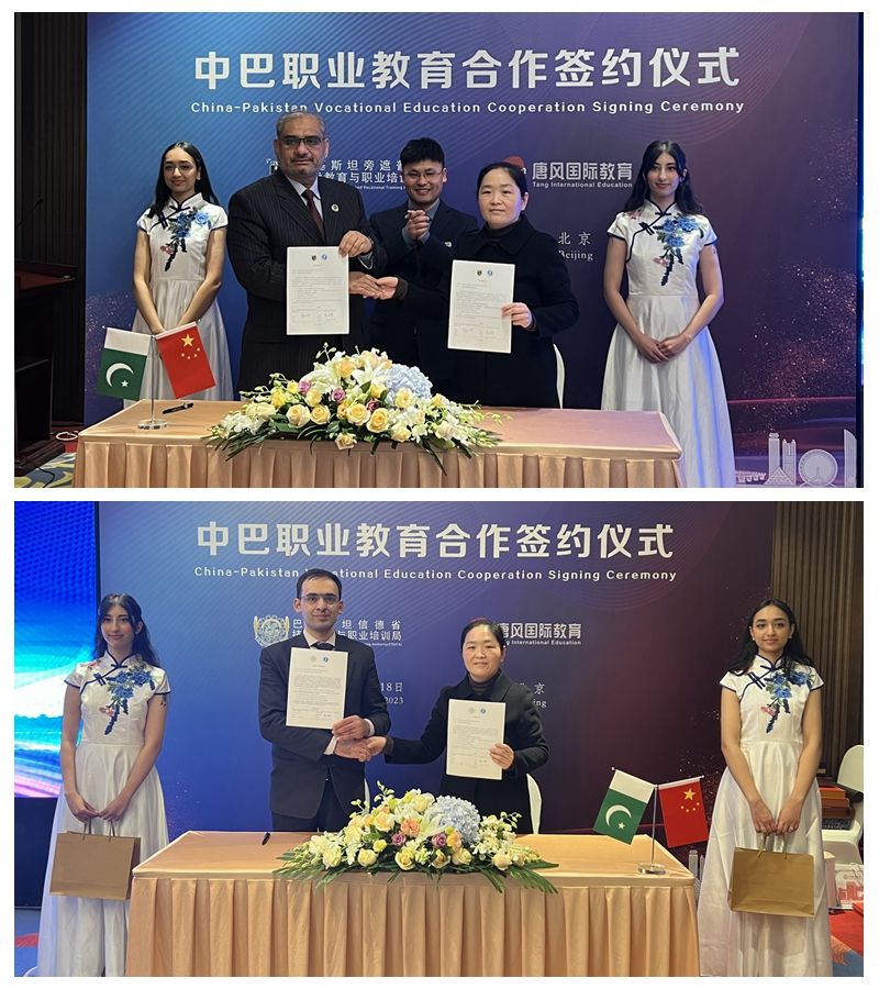 中巴国际合作论坛作为中国国际教育年会的组成部分,由中国教育国际交流协会、巴基斯坦伊斯兰共和国驻华大使馆、唐风国际教育集团联合主办。论坛主要以“数字教育国际化背景下的中巴教育合作”、“深化中巴校际合作,推动‘中文+职业技能’高质量发展”、“产教融合服务中巴经济走廊建设”等为主题进行了相关研讨。会上,吴旭锦介绍了咸阳职院基本情况并分享了学院近年来在服务“一带一路”倡议、国际化人才培养、交流互鉴等职业教育国际化办学品牌项目中取得的成果。同时,为进一步建立密切合作关系,2月18日上午,吴旭锦代表学院与巴基斯坦旁遮普省技术教育与职业培训局和巴基斯坦信德省技术教育与职业培训局等2家单位签署国际合作备忘录。