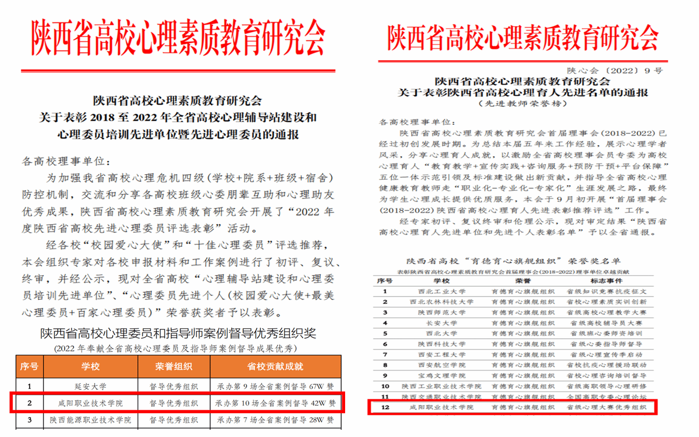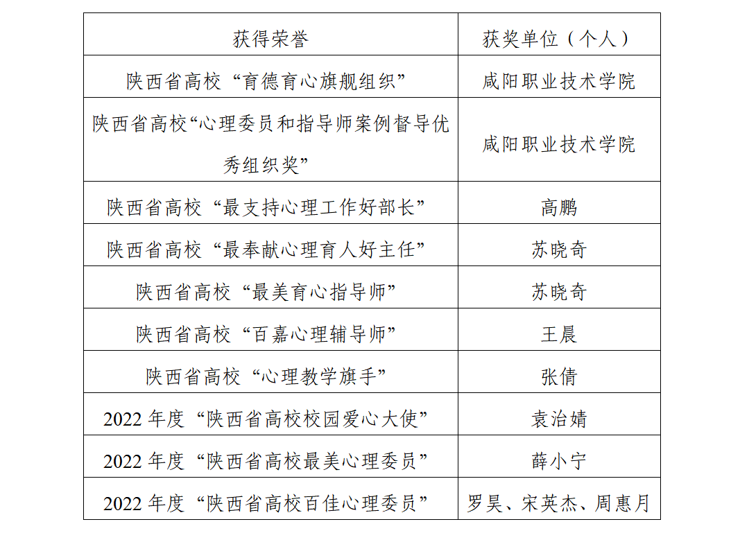 近期,陕西省高校心理素质教育研究会开展2022年陕西省高校心理育人先进集体、先进个人和2018至2022年全省高校心理辅导站建设、心理委员培训先进单位暨先进心理委员评选活动,咸阳职院作为首届常务理事会单位,荣获多项荣誉。