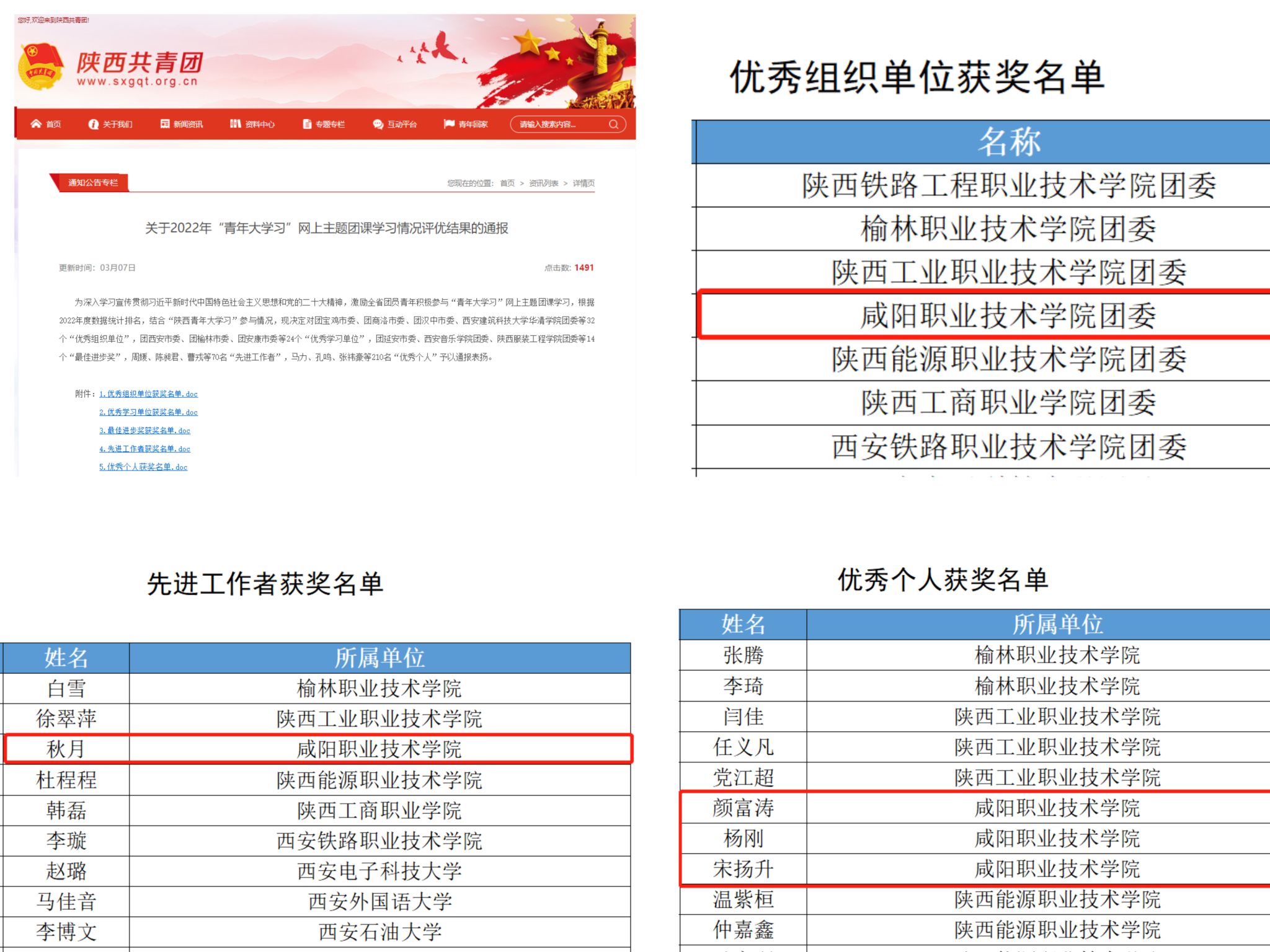 近日,共青团陕西省委下发了《关于2022年“青年大学习”网上主题团课学习情况评优结果的通报》,我院在2022年“青年大学习”网上主题团课学习情况评选中获得多项表彰。我院团委荣获“优秀组织单位”称号,院团委秋月荣获“先进工作者”称号,颜富涛等3人荣获“优秀个人”称号。