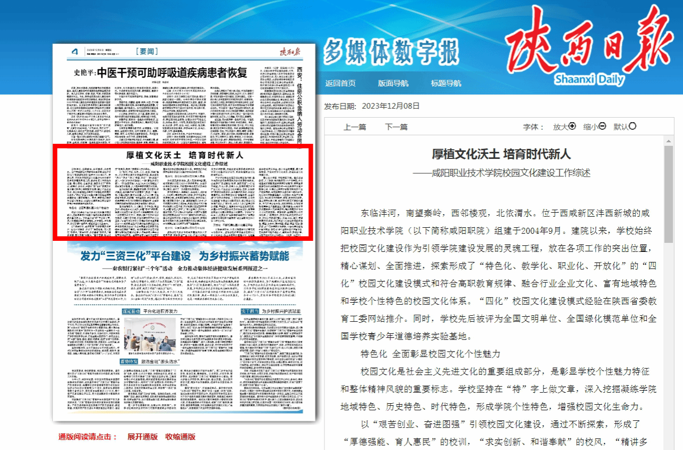 12月8日,《陕西日报》第4版要闻刊发学院校园文化建设成果文章《厚植文化沃土 培育时代新人——咸阳职业技术学院校园文化建设工作综述》。文章介绍学院探索形成了“特色化、教学化、职业化、开放化”的“四化”校园文化建设模式,建立了符合高职教育规律、融合行业企业文化、富有地域特色和学校个性特色的校园文化体系,推动职业教育高质量发展,培育德技并修高素质技术技能人才。现将全文转发如下: