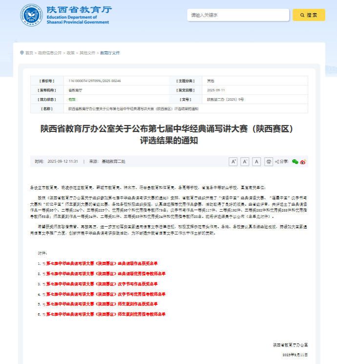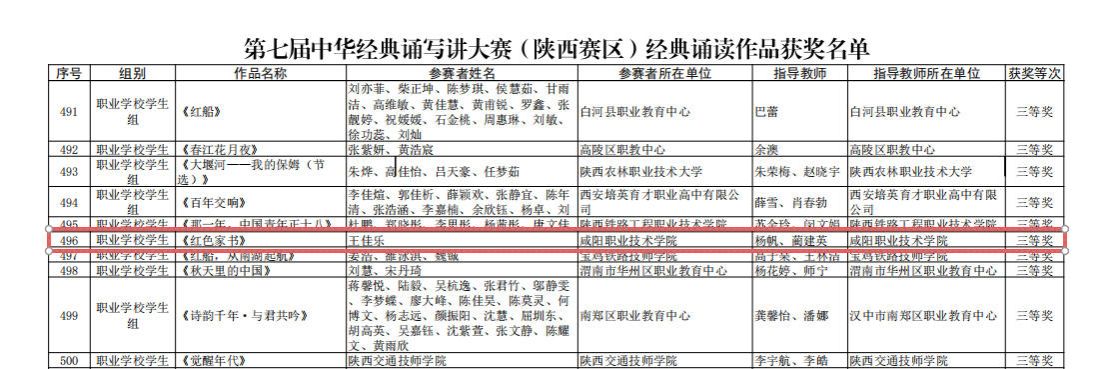 近日,陕西省教育厅办公室下发《陕西省教育厅办公室关于公布第七届中华经典诵写讲大赛(陕西赛区)评选结果的通知》,由咸阳职院信息工程学院王佳乐同学诵读,杨帆、蔺建英两位老师指导的参赛作品《红色家书》在众多参赛作品中脱颖而出,荣获三等奖。