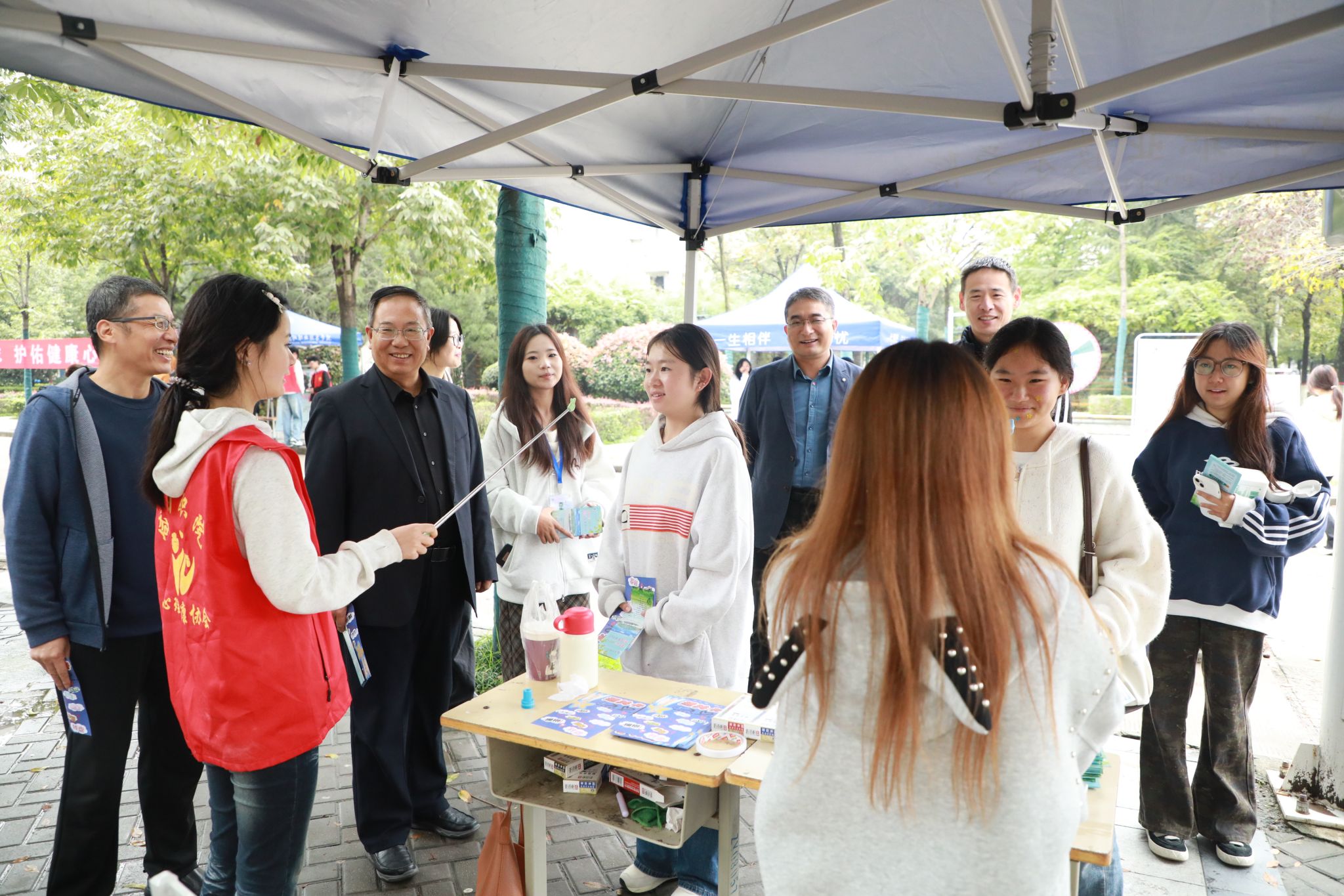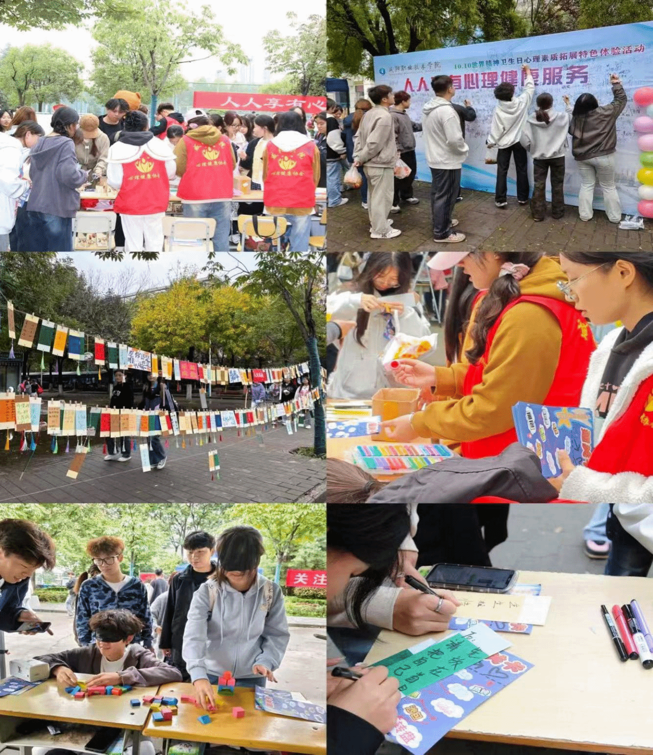 10月13日,咸阳职院在“一站式学生社区”开展以“人人享有心理健康服务”为主题的10·10“世界精神卫生日”宣传教育暨心理素质拓展特色体验活动。活动以创新有趣形式吸引了众多学生踊跃参与,学院党委副书记赵维亲临现场指导工作,与学生处相关人员及学生共同参与体验活动,并对本次活动的丰富内容与形式、学生参与度等方面给予高度评价。