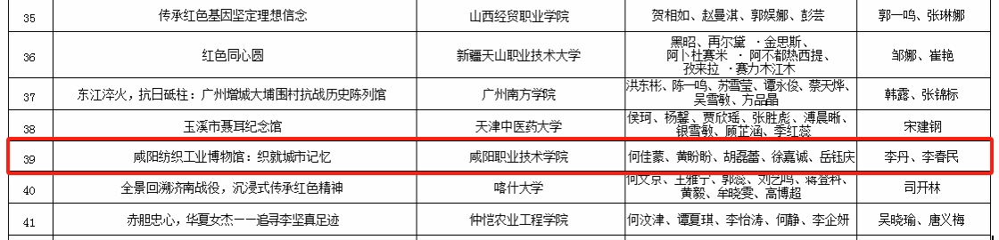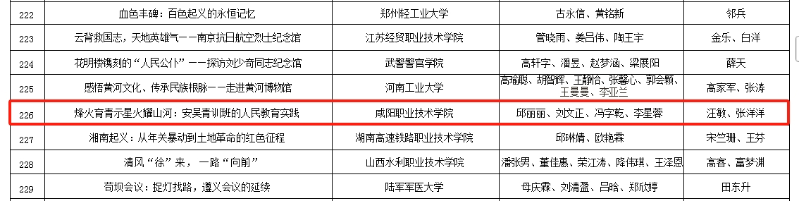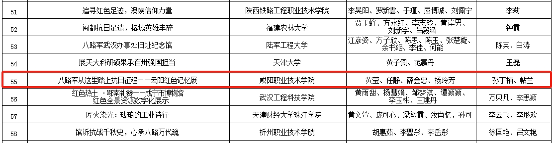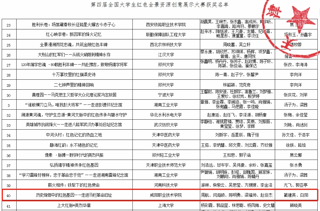 近日,第四届全国大学生红色全景资源创意展示大赛获奖名单公布,咸阳职院在全国31个省(市、自治区)330余所高校的1700余个参赛作品中脱颖而出,共8个作品在省赛获奖,4个作品入围国赛,分别获一等奖1项,二等奖2项,三等奖1项。