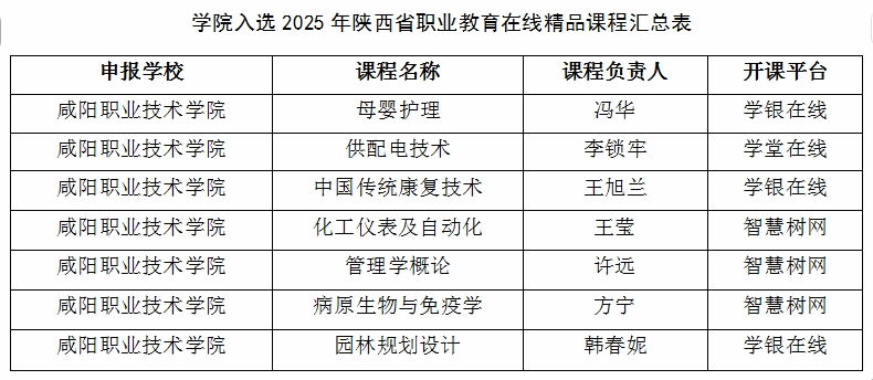 11月28日,陕西省教育厅印发了《关于公布2025年陕西省职业教育在线精品课程认定结果的通知》(陕教职办〔2025〕21号),咸阳职院《母婴护理》等7门课程被认定为2025年陕西省职业教育在线精品课程,学院省级在线精品课程总数达到46门。