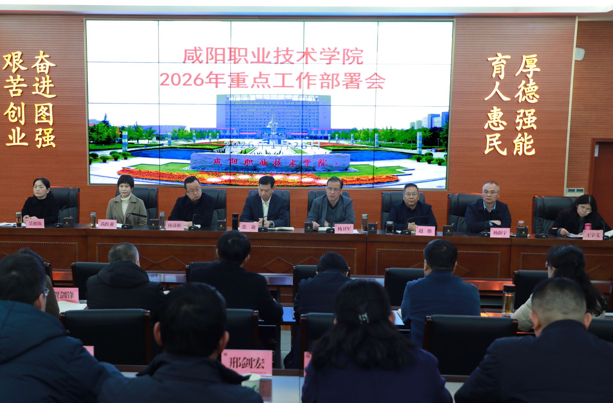 1月26日,咸阳职院召开2026年重点工作部署会,系统总结过去一年工作,全面谋划新一年发展蓝图。学院党委书记张迪,院长杨卫军,党委副书记、工会主席孙彦彬,党委副书记赵维,副院长芮红亚、杨新宇、吴旭锦,纪委书记王宇文,全院正科级以上管理干部参加会议。会议由张迪主持。