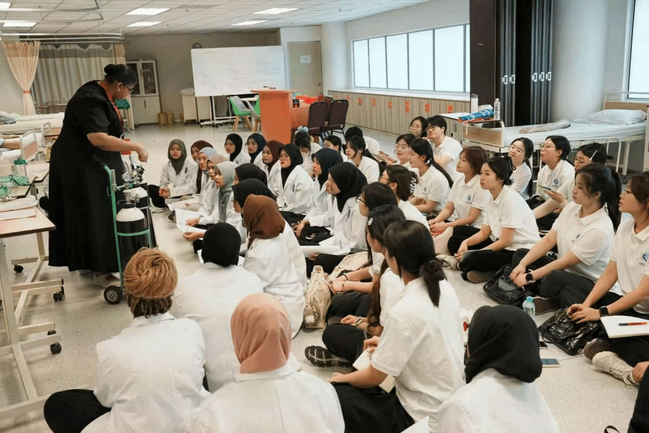 研学期间,师生深入玛莎大学教学与实践一线。在理论课程中,学生系统学习多项专业内容,构建了更全面的专业知识框架。在实训环节,师生进入该校先进的护理与物理治疗实训中心,开展氧气罐使用、无菌操作、急救应对等多项技能训练,提升了实际操作与应变能力。