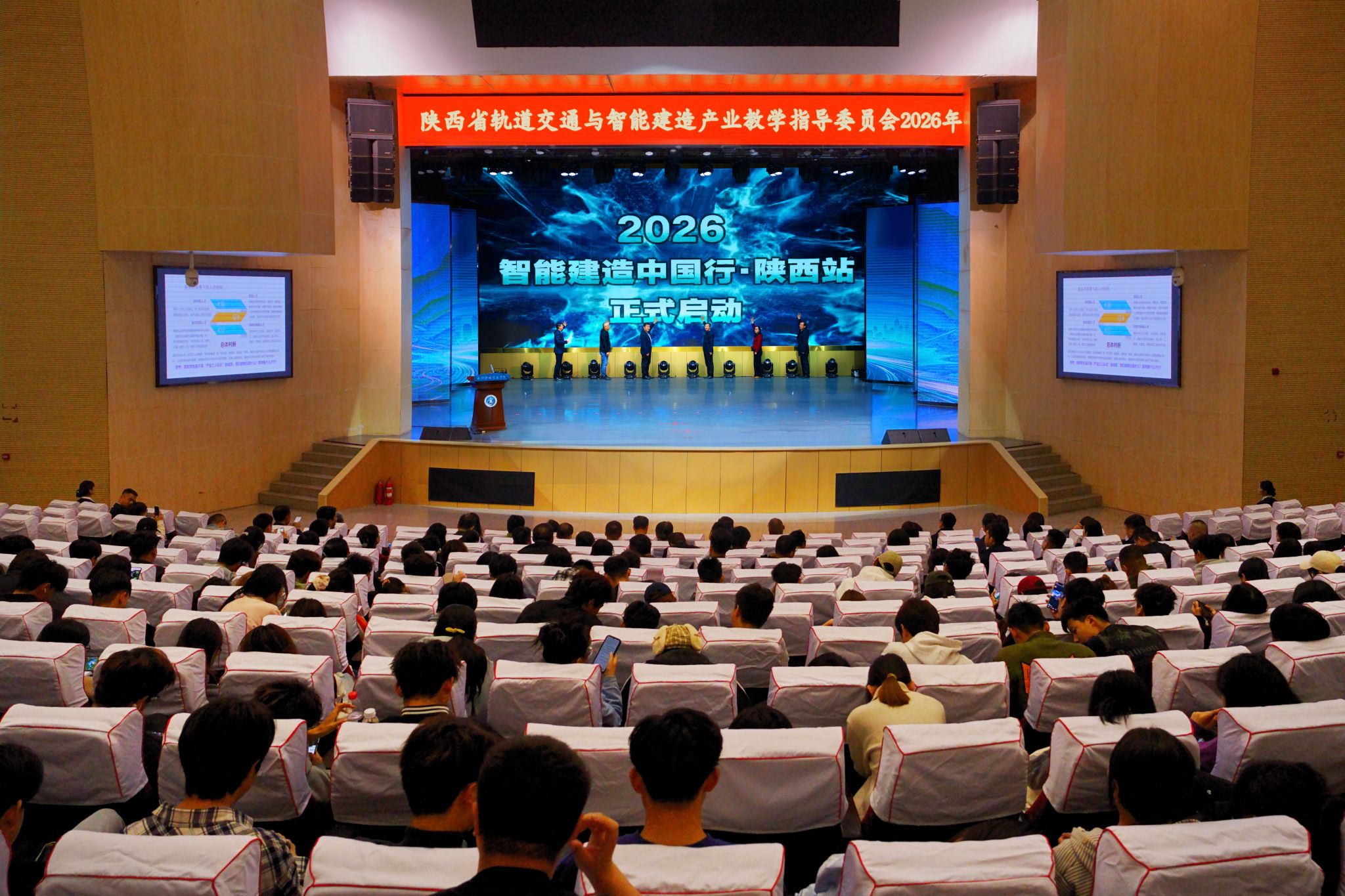 4月10 日,由陕西省轨道交通与智能建造产业教学指导委员会、中国建设教育协会高职与成人教育专业委员会主办,咸阳职业技术学院承办的陕西省轨道交通与智能建造产业教学指导委员会2026年年会暨“智能建造中国行・陕西站”活动在咸阳职院大学生活动中心举行。来自省内外兄弟院校的领导、院系负责人、专业带头人、骨干教师,科研院所、出版单位、行业企业及咸阳职院师生代表300余人参加。本次活动分为开幕启动、主旨报告、实践观摩三大阶段,全方位呈现了智能建造领域的政策导向、技术前沿与实践成果。