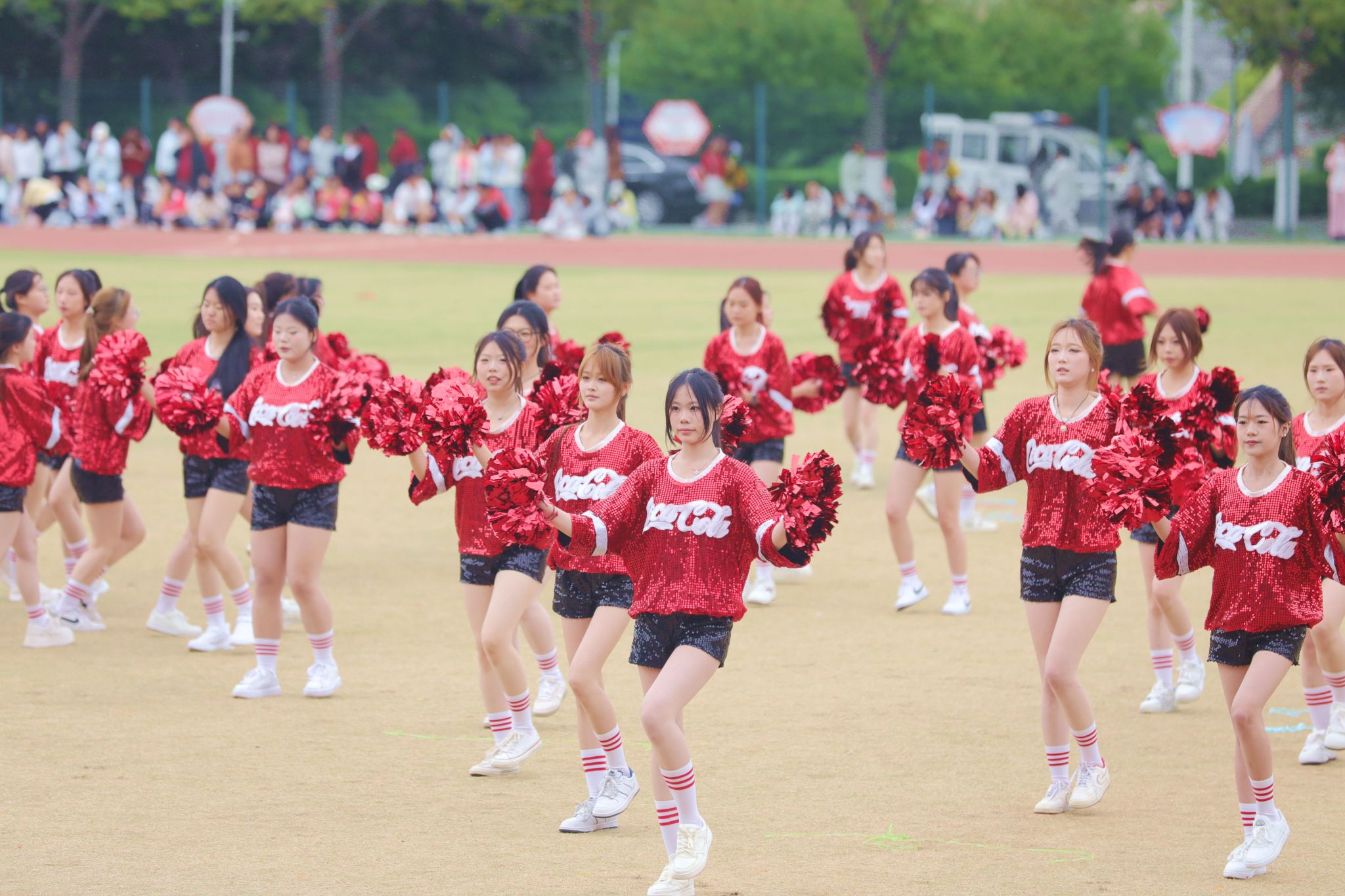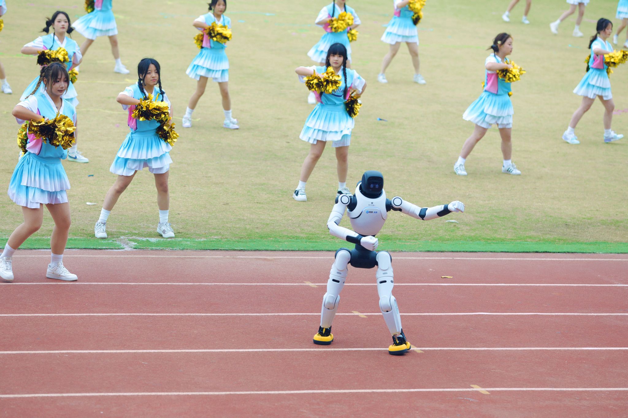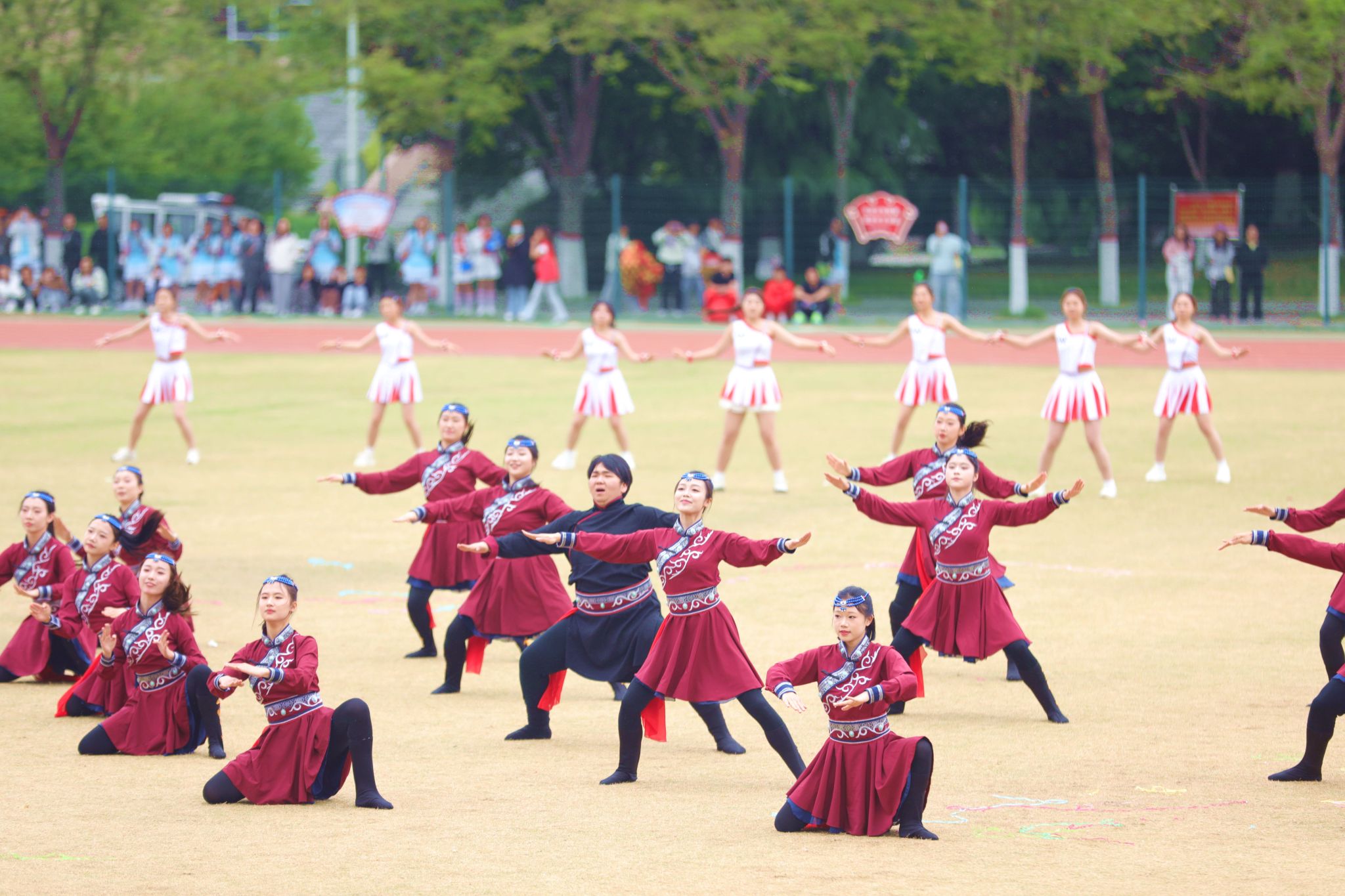 开幕式团体操表演将现场气氛推向顶峰。各学院精心编排的节目轮番登场,科技元素与传统文化的交融成为最大亮点。信息工程学院团体操表演融入了机器人和机器狗的协同演绎,科技感十足的“数字伙伴”与学子们灵动舞姿相映成趣,展现了咸职学子独有的温度与力量。机电学院团体操和着《精忠报国》的激昂旋律,传统京剧国粹与青春活力碰撞,展现中华优秀传统文化的时代风采。师范学院的“欢快小马”方阵与“奔腾骏马”方阵相映成趣,小马灵动可爱,骏马气势如虹,象征着教育事业的薪火相传与蓬勃发展。体育学院与咸阳市太极拳协会合作呈现太极扇展演,扇影灵动间尽显中华传统体育魅力,彰显校企同心、健康同行的时代风采。化工学院团体操队伍如精密仪器般井然有序,建筑工程学院啦啦操用动感舞姿诠释建筑韵律,财经学院团体操以智慧与激情的交响奏响逐梦前行的最美宣言……一个个精彩节目轮番上演,赢得现场师生阵阵喝彩。