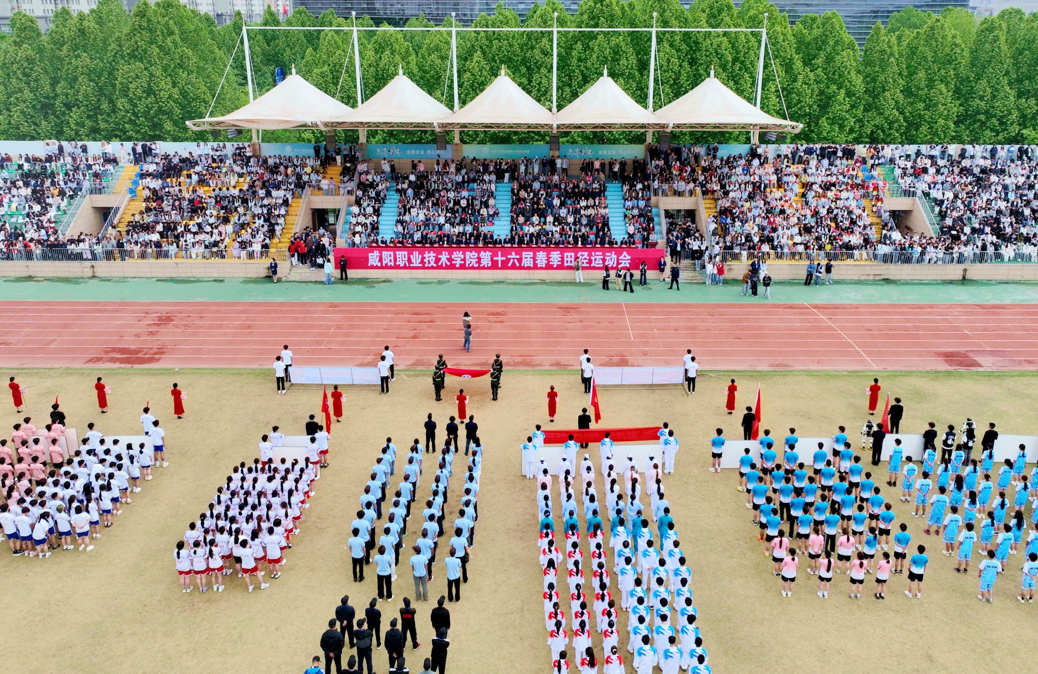 张迪郑重宣布:“咸阳职业技术学院第十六届田径运动会开幕!”全场掌声雷动,气氛达到高潮。