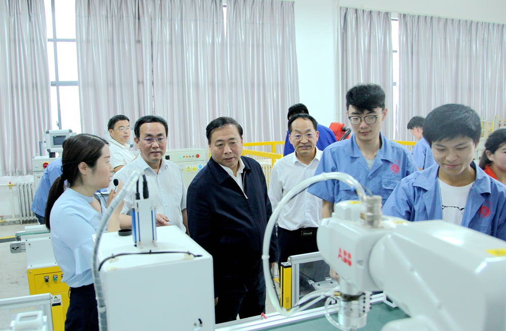 姜锋一行先后视察了汽车学院营销综合服务厅、整车拆装与检查实训室、综合故障诊断实训室、新能源汽车综合实训室、机电学院数控中心、电梯实训室、机械创新和工业机器人实训室、财经学院航空模拟机舱实训室和体育馆游泳馆。